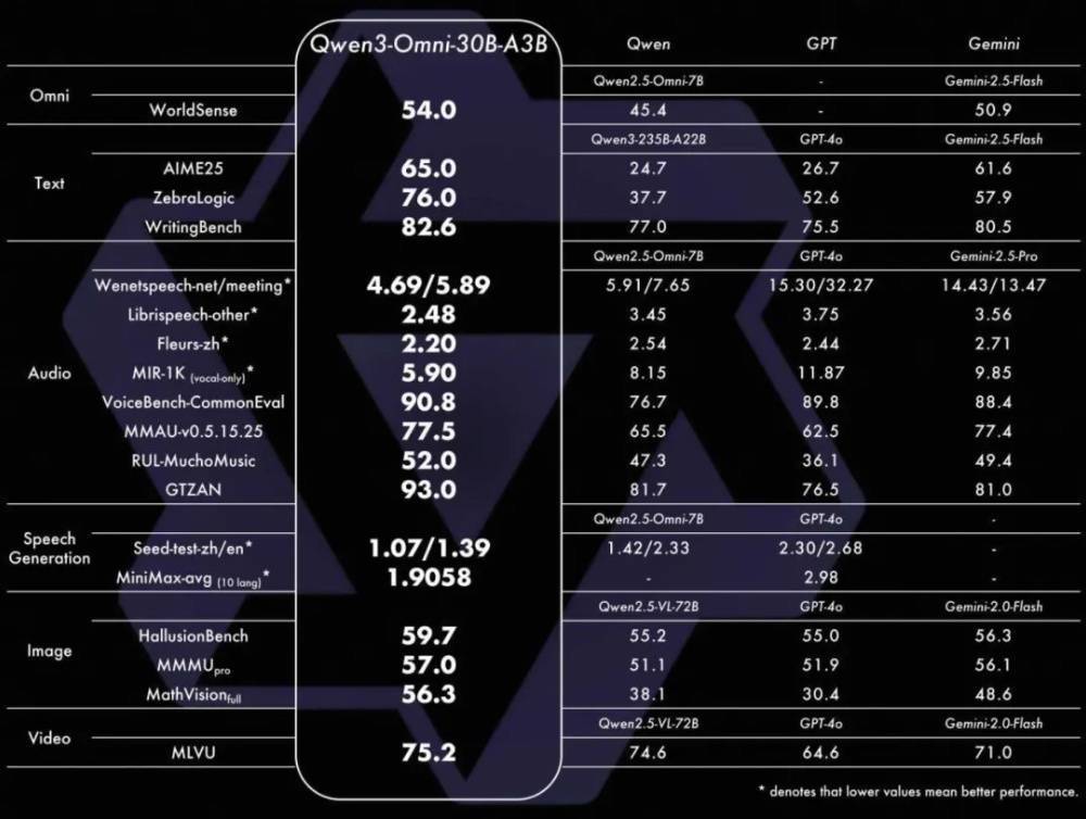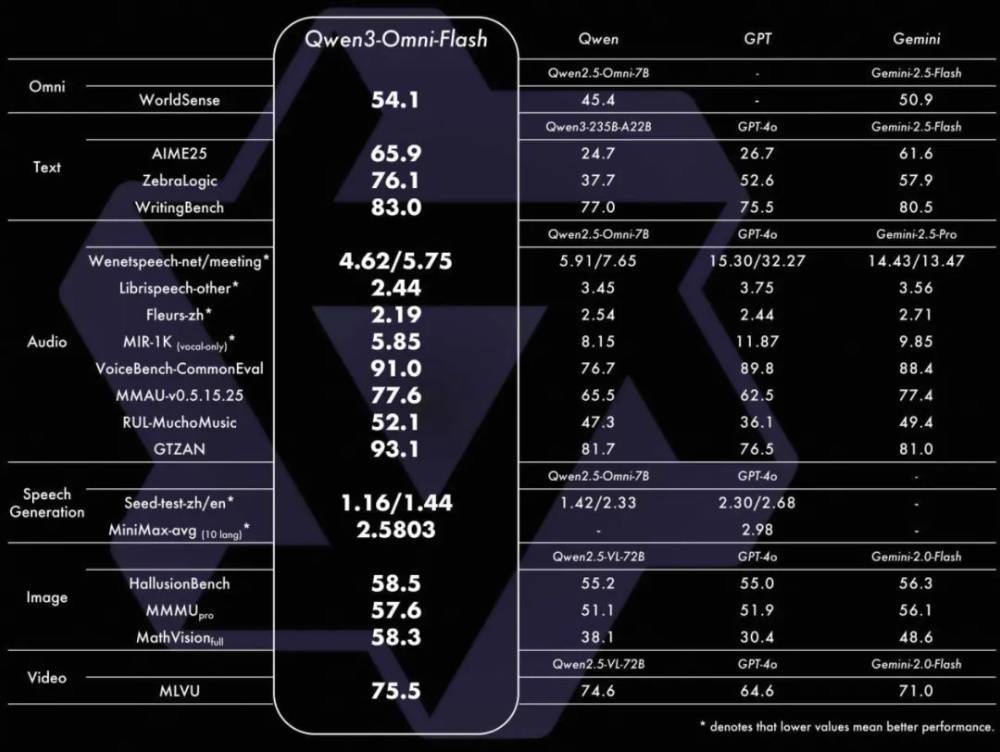该版本的模型在音频识别、语音生成、图像理解等任务上全面超越Qwen2.5-Omni与GPT-4o,VoiceBench-CommonEval得分达90.8,在AIME25、ZebraLogic等文本推理任务上得分更高,语音生成(MiniMax-avg)达2.5803,VoiceBench-CommonEval得分91.0,在开闭源评测中22项达SOTA水平,多项指标领先开源模型。